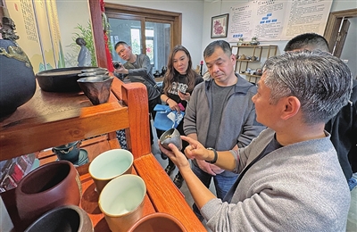 在张氏锔艺非遗工坊,第四代传承人张峰(右)向调研组展示作品。