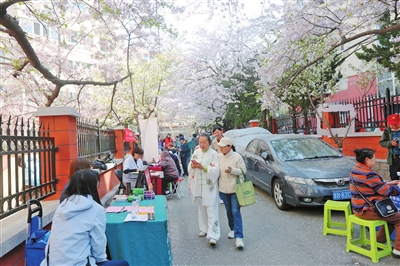 4月10日,青岛“家门口”的樱花网红打卡地,三明南路的樱花已经开放。市南区金门路街道三明路社区在这条“最美樱花小道”举行了第三届社区樱花节活动。