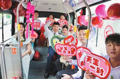 “来了来了!”5月10日上午,随着现场围观亲友的欢呼声,“宝宝巴士”的车门缓缓打开,身穿中式礼服的新娘曲晓彤被亲友簇拥着走下车。朱琛琛转身为她递上一束鲜花,并朝亲友们喊道:“今天终于开‘宝宝巴士’娶到我心爱的女孩啦!”车厢内外顿时响起掌声和笑声。这对新人选择了最特别的方式——公交车接亲,不仅圆了他们的“宝宝巴士”梦,还用实际行动践行了低碳环保的理念。