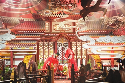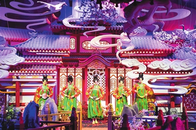 如果说婚姻登记与邮轮的邂逅是现代浪漫的创新表达,那么观赋格乐艺术中心及观赋宴的《万邦来朝——梦回盛唐》沉浸式夜宴,则是一场跨越千年的文化对话。踏入宴会现场,仿佛有一道时光之门悄然开启:头顶是璀璨的“星空穹顶”,脚下是复刻唐代纹样的青砖,身着齐胸襦裙的侍女手持宫灯引路,耳畔传来悠悠唐筚篥之声。宾客接过鎏金鹦鹉杯,杯中琥珀色的葡萄酒轻轻摇曳,眼前摆放的是依照《烧尾宴食单》还原的“素蒸音声部”“乳酿鱼”等宫廷美馔,每一道菜都配有一张诗词小笺,如“桃花流水鳜鱼肥”对应一道清蒸鳜鱼,让味蕾在品尝中邂逅唐诗意境。