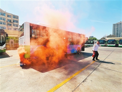 第二场景则模拟了电动公交车在行驶中电池舱突然冒烟的紧急状况。“师傅,后车厢冒烟了!”一名“乘客”惊慌地喊道。驾驶员贺鹏临危不乱,立即靠边停车,迅速启动机舱灭火装置,同时果断切断电源。“请大家不要慌,按顺序下车!”他一边大声引导“乘客”疏散,一边熟练地打开应急车门和逃生天窗,不到30秒,所有“乘客”都被转移至30米外的安全区域。