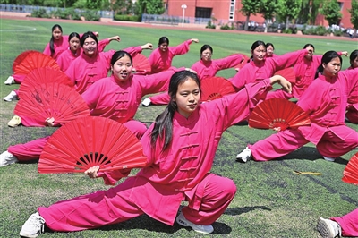 除了“少年拳”武术操,太极扇表演也是即墨区七级中学课间活动的一大亮点。在学校的操场上,一场极具韵味的太极扇表演时常热烈上演。学生们手擎太极扇,整齐列阵,随着悠扬的音乐响起,他们步伐轻盈,开合有序,扇子或展或收,宛如一朵朵绽放的繁花。一招一式中,既有太极的圆润柔和,又有扇法的凌厉洒脱;一举一动间,既沉稳整齐,又灵动如水,将太极文化中阴阳和谐之道演绎得淋漓尽致,充分展现了新时代青少年的活力与激情。学生朱玥兴奋地表示:“练习太极扇不仅让我感受到了武术的快乐,在舒展筋骨的同时还能释放学习压力,让我以更轻松愉悦的状态投入到学习中。”近年来,该校积极开展“阳光大课间”系列活动,将太极扇项目引进校园,旨在丰富校园文化生活,增强学生体质,促进学生身心健康发展。