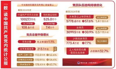 截至2024年底,大专及以上学历党员5778.6万名,占57.6%,比上年提高1.4个百分点;女党员3099.5万名,占30.9%,比上年提高0.5个百分点;少数民族党员773.4万名,占7.7%,与上年持平;工人和农民仍是党员队伍主体,占总数的32.7%。