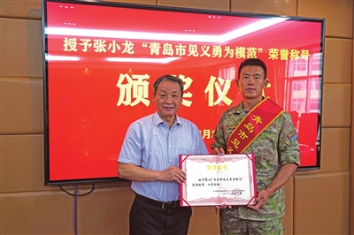 早报7月1日讯 6月26日,青岛市委政法委、市见义勇为基金会在中国人民解放军北部战区海军某部举行授予张小龙“青岛市见义勇为模范”荣誉称号颁奖仪式,向张小龙颁发了“青岛市见义勇为模范”荣誉证书和奖金。据悉,张小龙决定将奖金全部捐献给该部队定点援建的爱新色里镇海军希望小学。