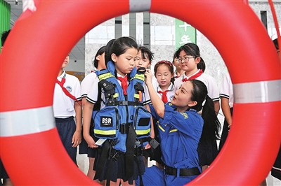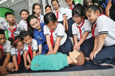 在模拟急救环节,队员们借助模拟假人,将判断心脏骤停、呼吸停止的方法,以及胸外按压、人工呼吸等心肺复苏操作的流程,向学生们进行了细致的分步展示,每一个动作都承载着守护生命的重量。“一到夏天,尤其是暑假,八九岁的孩子最容易发生溺水事故。一方面家长无暇全天看护,另一方面孩子缺乏必要的救生技能和安全意识。我们要用亲身经历,为孩子们敲响安全警钟。”蓝天救援队队员姜仁彤道出了开展此次活动的初衷。