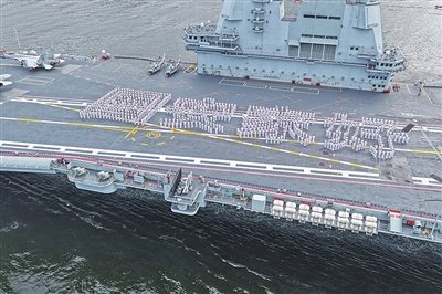 山东舰,舷号17,是我国首艘完全自主设计建造的常规动力航空母舰,2017年4月26日下水,2019年12月17日入列。山东舰的飞行甲板面积相当于2个标准足球场,高度达到20层楼左右,内部有3000多个舱室,是一座移动的“海上机场”,正常排水量6万余吨,能搭载数十架舰载战斗机、各型直升机。作为大国重器,山东舰持续加强练兵备战,多次赴远海执行实战化训练任务,联合作战能力得到持续提升。