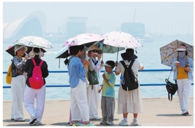 7月6日,在副热带高压的强势“掌控”下,青岛迎来高温天气,市区最高温度突破30℃,体感炎热。记者在奥帆中心、五四广场沿海一线采访时看到,许多顶着烈日出行的市民和游客已经“全副武装”,遮阳伞、防晒帽、墨镜、防晒口罩等齐上阵,人群中频现“蒙面侠”。