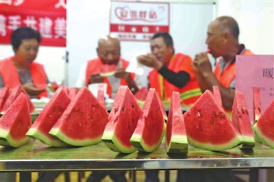 入夏以来,观澜社区志愿者专门开展了“夏日送清凉,防暑保健康”主题活动,不仅备足了酸梅汤、绿豆汤、矿泉水等解暑饮品,还送上风扇帽、风油精等防暑物资,还邀请医护人员来讲解防暑知识。社区志愿者将切好的西瓜递到快递小哥手中,把清凉的饮品送到环卫工人嘴边,每一份关怀都精准对接着高温下的需求。