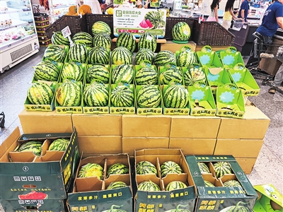 7月9日上午,记者来到位于崂山万象汇负一楼的盒马鲜生门店。正值西瓜销售旺季,货架上摆满了麒麟瓜、甜王、8424等多个品种的西瓜,不少市民正弯腰挑选,不时用手指轻敲瓜皮,听声音来判断好坏。
