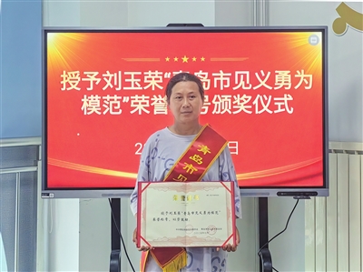 早报7月11日讯 7月10日,青岛市委政法委、市见义勇为基金会在市南区八大峡街道西镇社区举行了见义勇为模范颁奖仪式,宣读了《关于授予刘玉荣“青岛市见义勇为模范”荣誉称号的决定》,向刘玉荣颁发了荣誉证书和奖金。