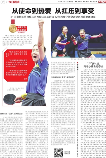 时间会带走年轻的身体,但永远不会磨蚀勇士的精神。在本届全运会上,身为老将的陈梦以担当和韧劲,为团队带来力量与感动。当陈梦获得女团冠军后拥抱队友时,十五运乒乓球金牌的分量已不同往昔。这枚全运会乒乓球女团金牌,不仅是陈梦和队友辛勤付出的荣誉证明,更是山东乒乓“团结拼搏、薪火相传”精神的生动延续。