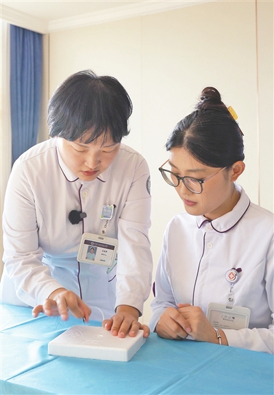“要多练,多练就对了。”当被问及“飞针”技术核心要领时,王亚男的回答简单而笃定。这轻描淡写的“多练”二字,背后是她和同事们无数个日夜的汗水与坚持。王亚男最先在泡沫板上练习,她在板上点上一个细小的墨点,模拟血管的位置,然后成千上万次地重复“飞针”动作,只为磨练那毫厘不差的准头。“墨点很小,而血管比它粗得多,能扎准墨点,扎血管就没问题。”她解释道,这种严苛的自我要求是为了确保在真实、有走向的血管上扎针时万无一失。