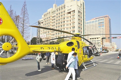 组图:患者乘直升机从西海岸新区人民医院开始转运。