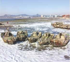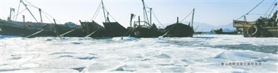 即墨鳌山卫街道盘龙庄码头几十艘小型渔船整齐排列在岸边,船身下半部被浮冰牢牢固定,如同镶嵌在“冰床”中。随后,记者在即墨田横湾、丁字湾等海域也发现不同程度的海冰现象。