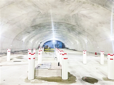 混凝土施工全链条方案保障结构“内实外美”。57米的超深距离,让混凝土垂直运输、现场布料、后期养护成为施工中的三大核心难点。项目团队创新构建“运输-布料-养护”全链条混凝土施工解决方案,逐一破解施工难题:通过垂直下料管搭配改装叶片式搅拌机,对混凝土进行二次搅拌,有效避免长距离垂直运输造成的性能损失,确保混凝土保持良好工作性抵达地下57米作业面;仰拱浇筑启用自动布料机,浇筑效率提升55%,侧墙采用三点式布料工艺、拱部配套专属自动布料系统,确保混凝土在狭小空间内分布均匀,无死角、无空洞。针对大断面隧道养护质量难控的痛点,项目配套使用大断面隧道封闭式恒温恒湿智能养护系统,由自动喷淋行走台车与加热智能恒温系统协同运作,为混凝土打造专属“定制养护舱”,精准控制养护温度与湿度,保障混凝土强度稳定增长,最终实现车站结构内实外美、不渗不漏,一次验收合格率大幅提升。